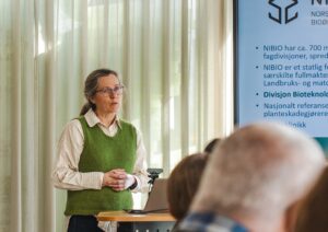 GMO-nettverkets årsmøte startet med en faglig del. Kan gener fra ville potetarter bidra til å redusere både tørråte og bruk av sprøytemiddel? var overskriften på innlegget holdt av May Bente Brurberg, seniorforsker i molekylær plantepatologi ved NIBIO. Brurberg er en erfaren forsker som har jobbet over lengre tid med tørråteproblematikk i potetproduksjon, og hun er ansvarlig søker av utsetting av GMO-potet i norsk feltforsøk, som nå er godkjent av Miljødirektoratet.